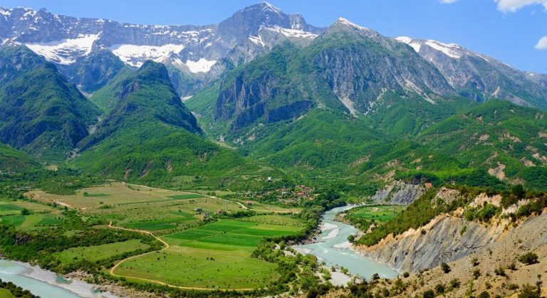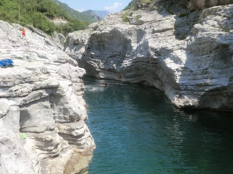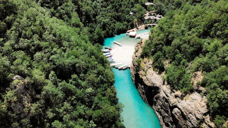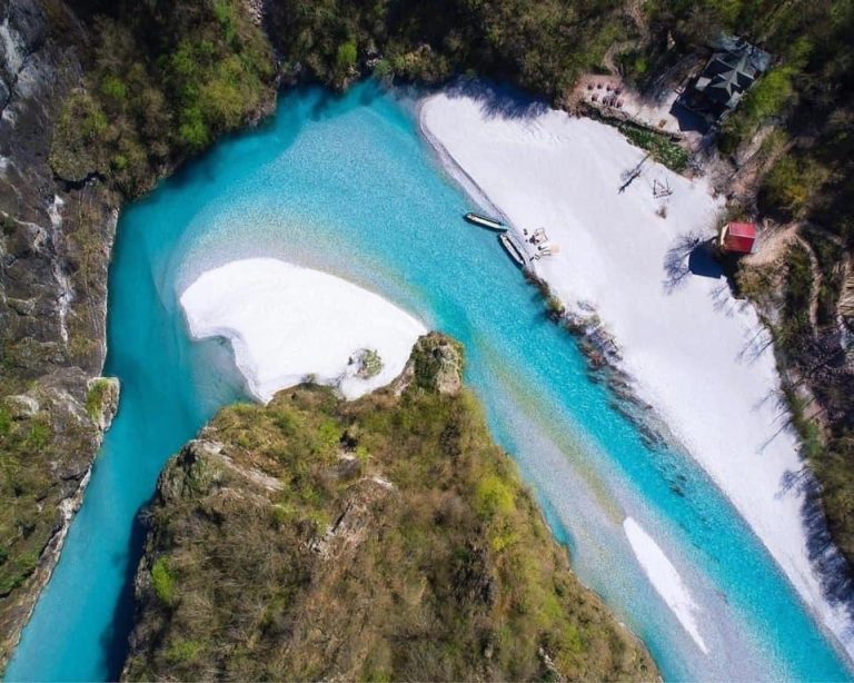 Der Shala River entspringt am Fuße der albanischen Alpen und schlängelt sich durch hohe Klippen in Albanien. Er wurde aufgrund seiner intensiven Farben und beeindruckenden Landschaft als „Thailand von Albanien“ bezeichnet. Der 37 Kilometer lange Fluss fließt durch verschiedene Städte, bevor er in den Koman-Stausee mündet. Der Shala River ist bekannt für sein kristallklares Wasser und seine vielen Fische, insbesondere Forellen. Die kalte blaue Farbe des Wassers und die steilen Felsen umgeben ihn zu einem malerischen Ort für Outdoor-Abenteuer wie Kajak- und Kanufahren. Darüber hinaus bietet der Fluss atemberaubende Ausblicke auf die umliegenden Berge und ist bei Badegästen beliebt. Die kalte blaue Farbe des Wassers ist charakteristisch für diesen Fluss, die steilen Felsen, die ihn umgeben, scheinen mit ihren Händen den Himmel zu berühren.