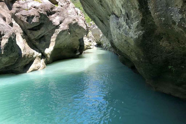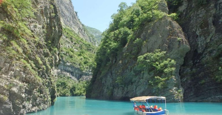Koman-Stausee: Eine wunderschöne Schlucht, die türkisfarbenes Wasser aufweist.